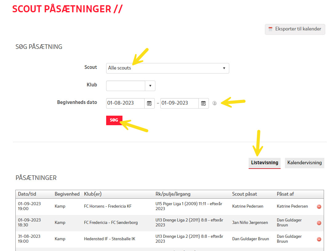 Du kan søge på en bestemt scout, en klub som er involveret en en scouting begivenhed og/eller et dato interval. Du kan også vælge bare at trykke Søg ud fra det angivne interval.
