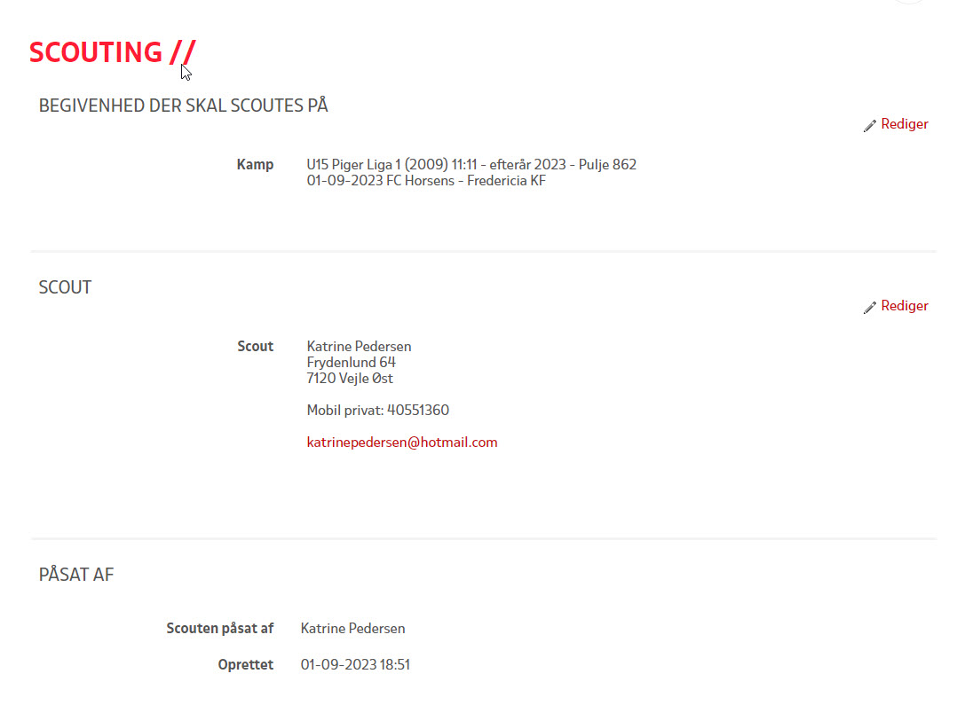 Hvis du vil ændre den begivenhed, som der skal scoutes på, vælger du Rediger ud for denne. Du kan nu vælge en anden kamp eller anden begivenhed. Når du trykker på GEM, afsendes en ændringsbesked til den påsatte scout. Bemærk, hvis en landskamp eller en alm. turneringskamp flyttes i DBU's turneringssystem, så afsendes der  IKKE automatisk en ændringsbesked. Vi foreslår dig i stedet at bruge vores Fodbold app til at holde dig orienteret. Her kan du sætte notifikationsbeskeder op på et givent hold, således at hvis der sker ændringer, så vil du modtage en notifikation herom.