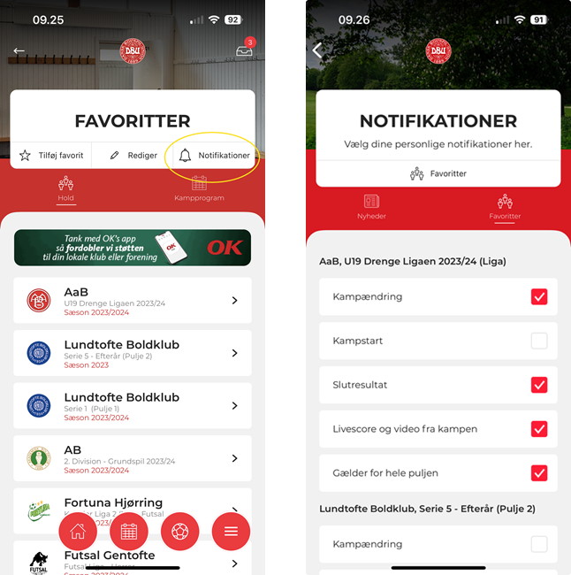 I Fodbold app'en, ser det således ud. Jeg har valgt AaB's U19 hold som Favorit (du skal naturligvis værre logget på for at benytte denne funktion). I notifikationer - som vælges øverst til højre (se dump nedenfor) - kan jeg angive hvilke beskeder jeg ønsker om dette hold.