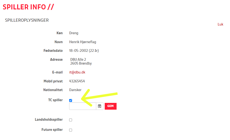Gå ind på spilleren. Tryk på "Spiller info", dernæst på "Rediger". Herefter får man mulighed for at sætte en markering i feltet "TC", hvilket giver mulighed for at angive dato for spillerens start i Talentcenteret.