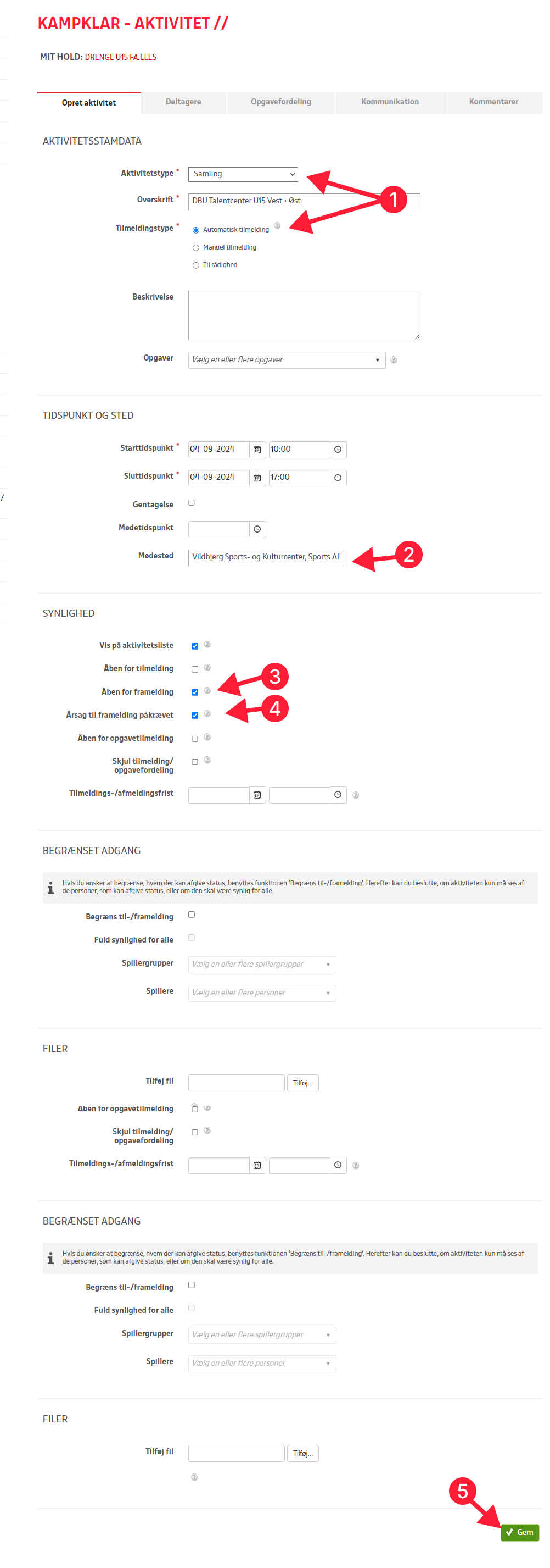 - Vælg aktivitetstypen ”Samling”, hvor tilmeldingstypen er ”Automatisk tilmeldt”.