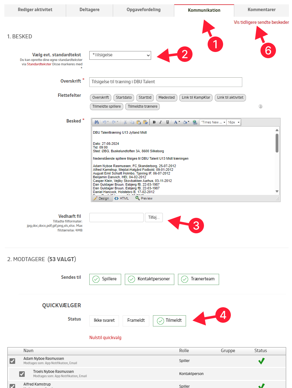 (så er det kun de tilmeldte - der for mailen). Efter du har valgt ’Tilmeldt’ kan du se, at det er de personer med et flueben du sender til. - Tryk send i bunden af siden