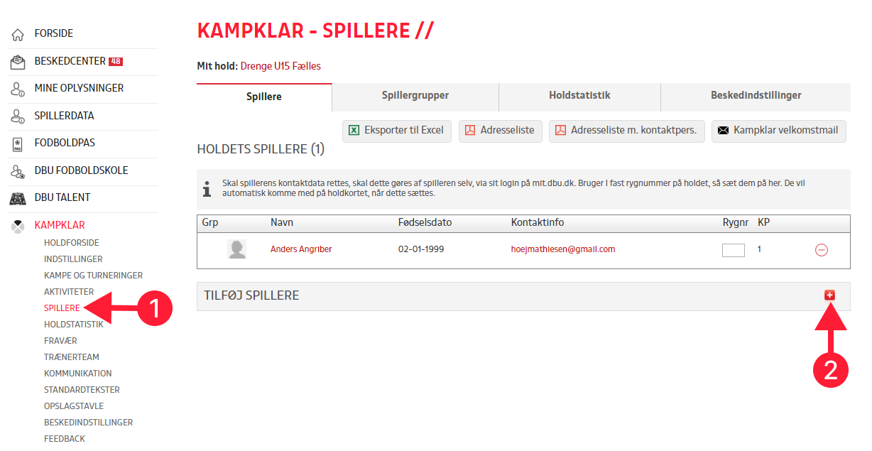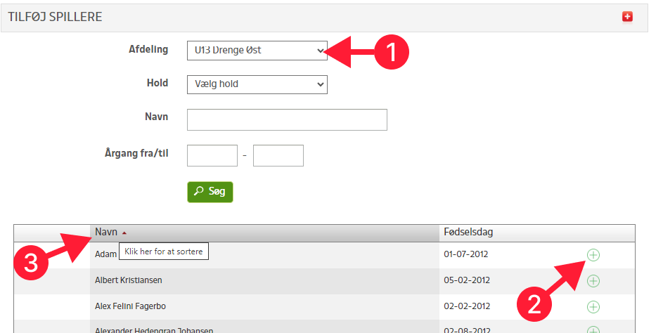 Efterfølgende åbnes området "Tilføj spillere". Her kan du fremsøge de spillere, som allerede er oprettet i Talentcenteret: