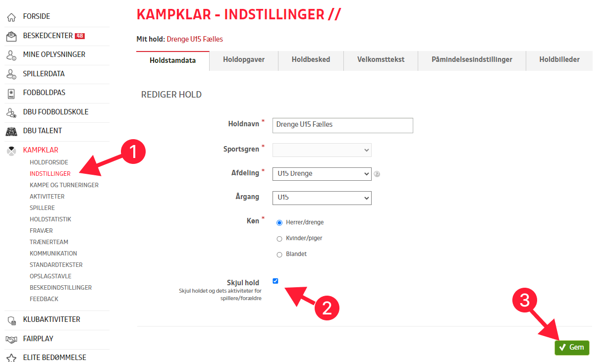 Gå til siden ”Indstillinger” for at tjekke at holdet