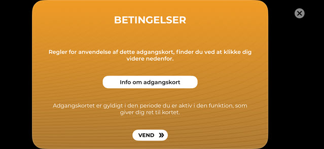 På bagsiden kan der ved tryk på "Info om adgangskort" aflæses hvilke rækker, kortet giver adgang til.