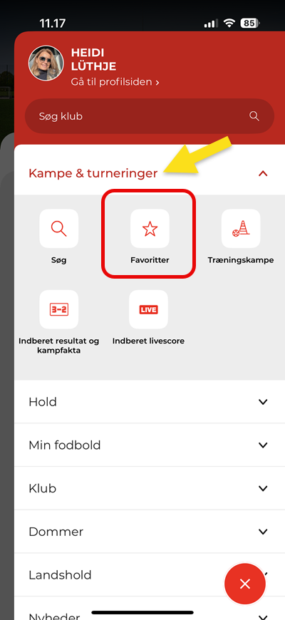 2) Tryk på 'Kampe & Turneringer' og derefter på Favoritter