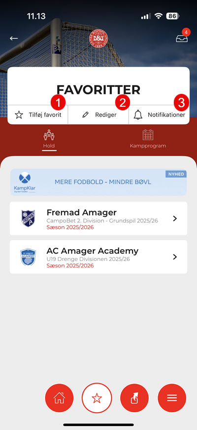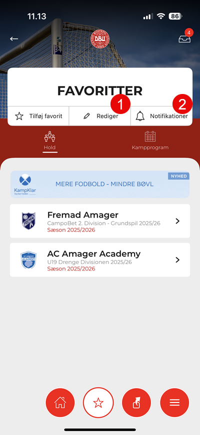 Du kan redigere/sortere dine Favoritter (1). Og indstille notifikationer (2) om kampændringer, kampstart, slutresultat samt livescore og video.