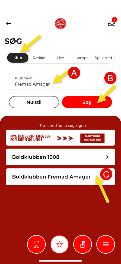 Nu trykker du så på "Tilføj favorit" (1), søger klubnavnet frem (A-B) og vælger klubben (C). Herefter trykker du på stjernen ud for det hold, du ønsker som favorit (D)