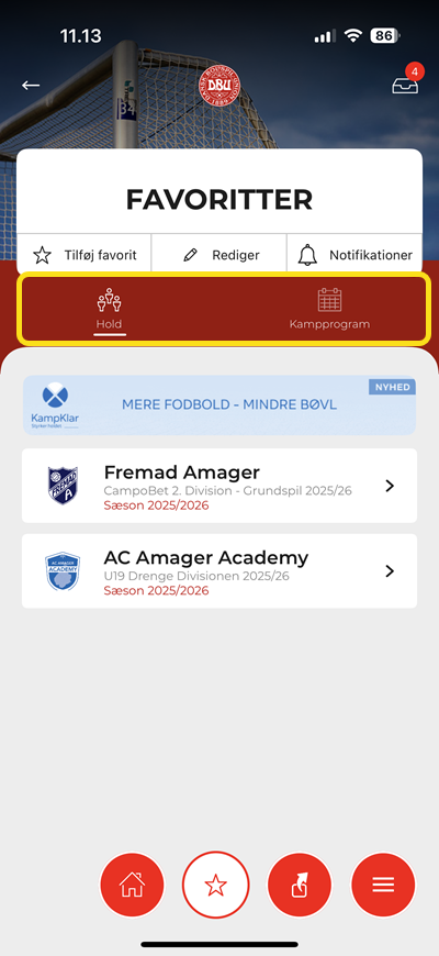 Når du har valgt dine favoritter, kan du se alle dine favorithold samt deres kampprogrammer. Skift mellem 'Hold' og 'Kampprogram' (samlet for alle dine favoritter) ved at skifte mellem tabs'ene "Hold" og "Kampprogram".