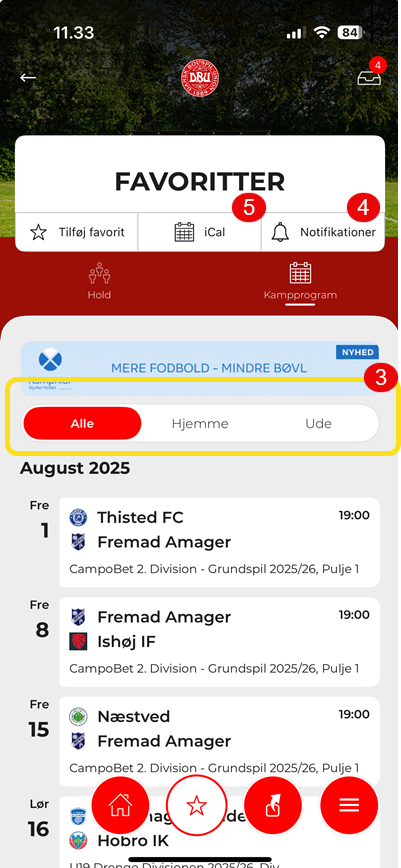 Via de tre tabs over kampprogrammet, kan du desuden vælge, om du vil have vist alle kampe, eller kun hjemme- eller udekampe (3). Du kan vælge dine egne notifikationer (4), og du kan også abonnere (eksportere) det samlede kampprogram til din egen kalender med et 'iCal link' (5).