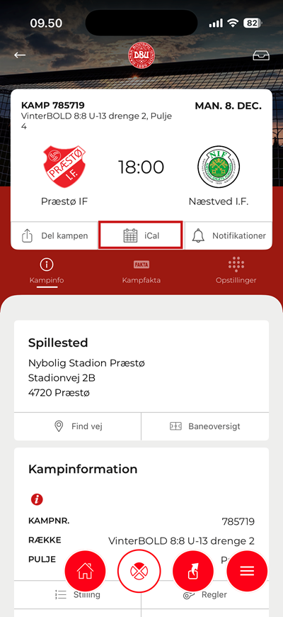 2. Tryk på iCal for at tilføje kampen