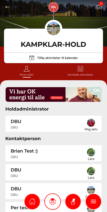 Hvis man har flere hold eller flere roller i KampKlar - som holdadministrator (træner/holdleder), spiller eller kontaktperson - så vises de forskellige roller, når man går ind i KampKlar fra 'Min Fodbold' eller 'Burgermenuen'.