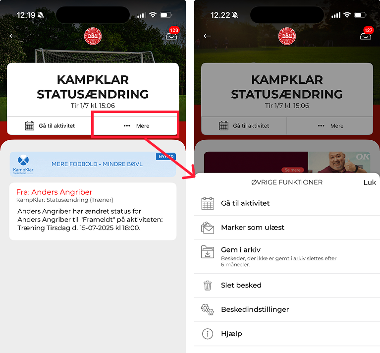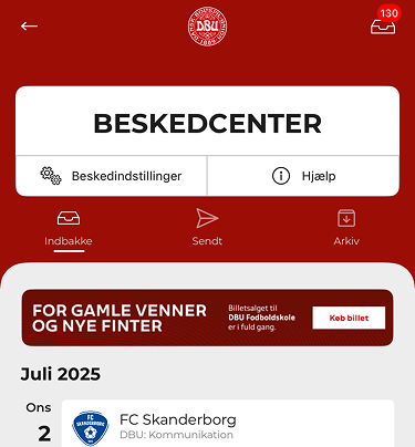 Beskedcenter findes i øverste højre hjørne på forsiden af Fodbold app'en - og også på Mit DBU.