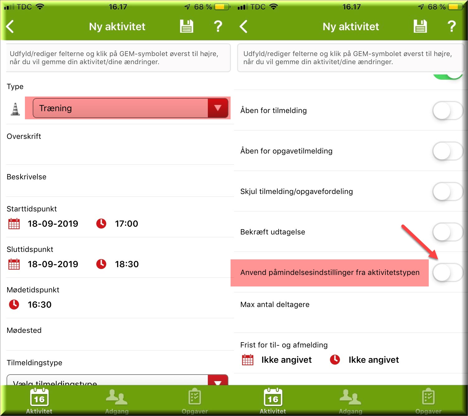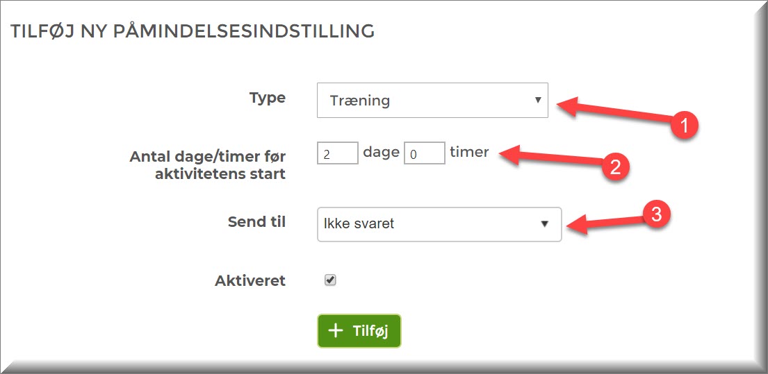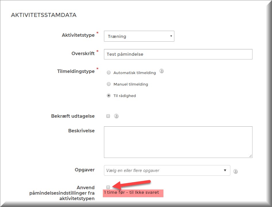 1) Vælg hvilken type aktivitetet, der skal sendes påmindelser om - fx 'træning', 'kamp' eller 'træningskamp'.