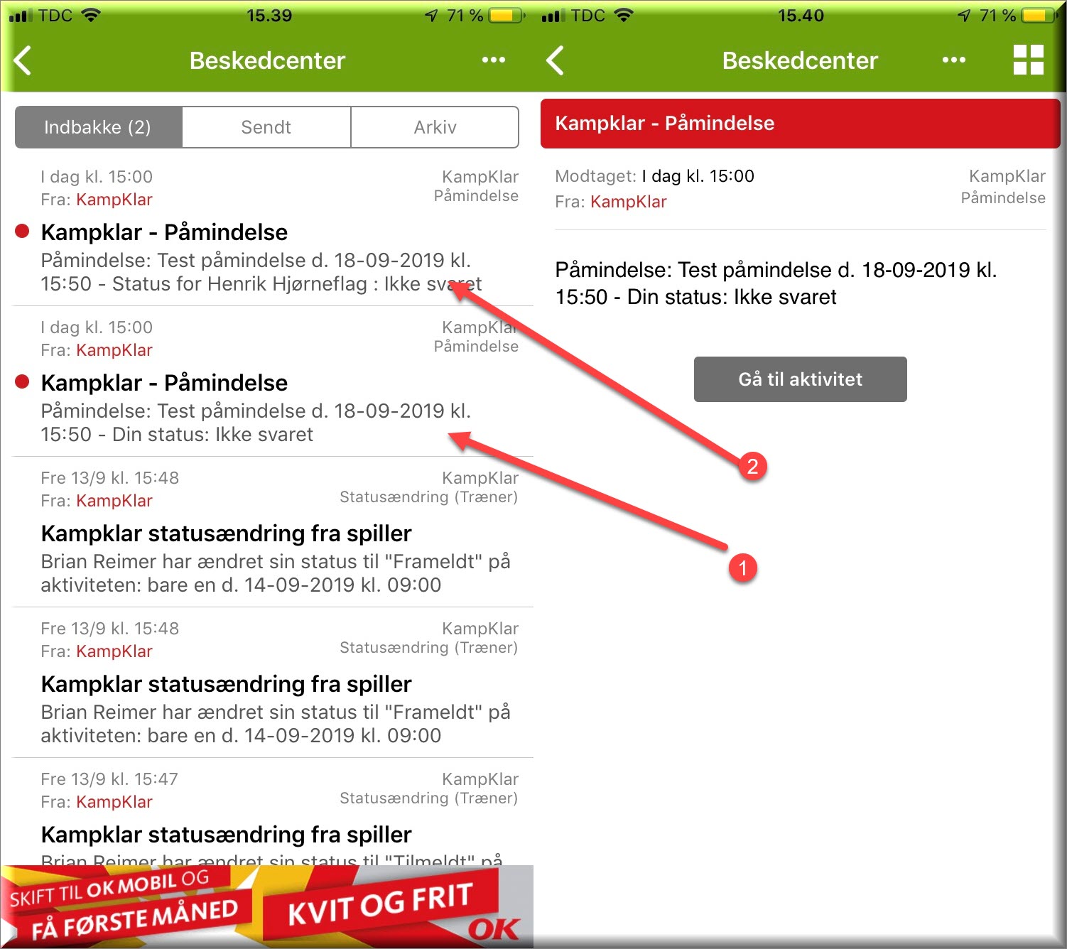 Påmindelser sendes til spillere (1) og kontaktpersoners (2) 'Beskedcenter'. De videresendes som udgangspunkt som notifikation (hvis det er slået til på modtagerens enhed).