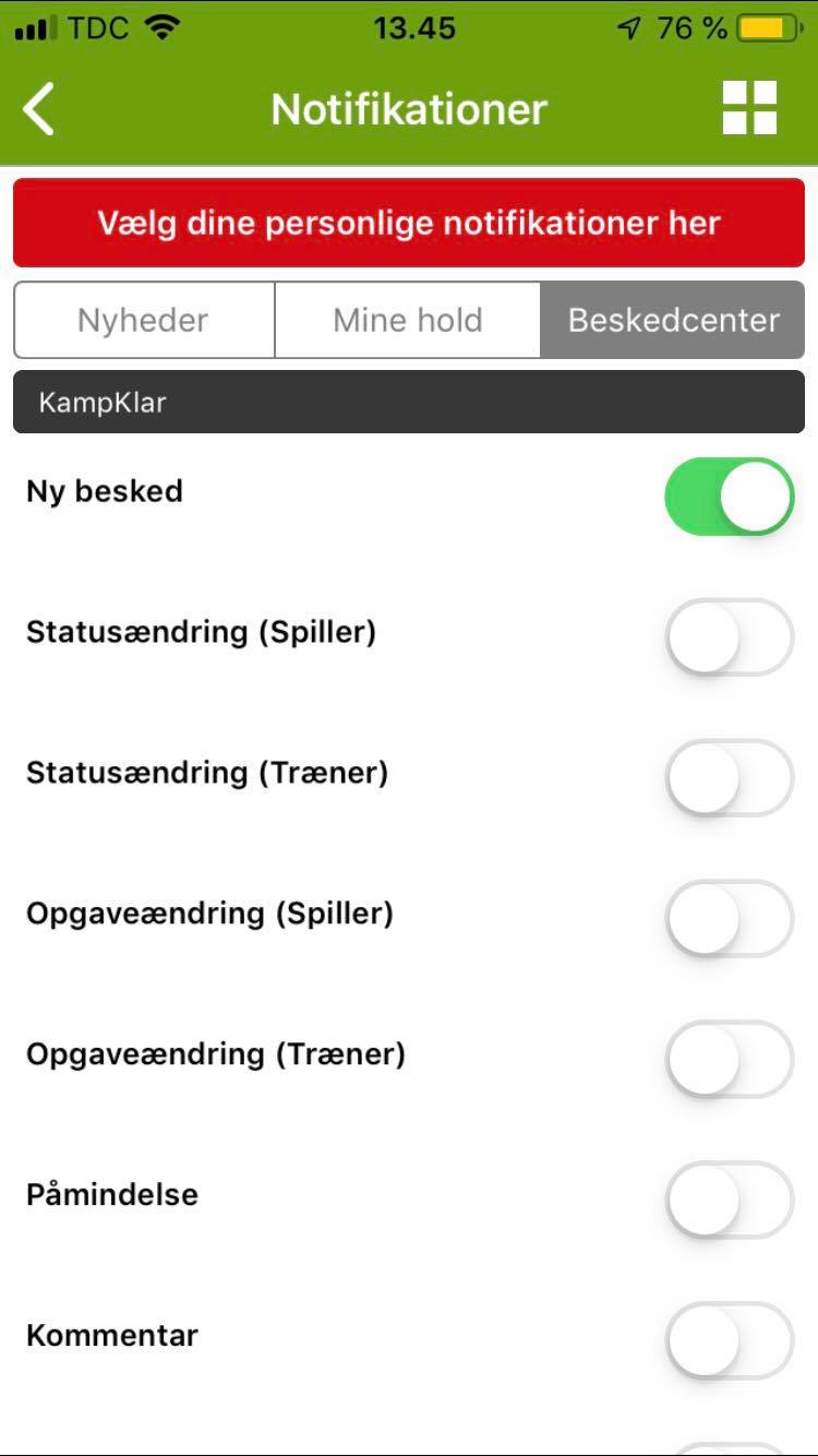 Hvis man er træner eller holdleder kan det være lidt overvældende med 24 beskeder, hver gang spillerne til- eller framelder sig, eller kommenterer på aktiviteter. Hvis man foretrækker bare at følge med på aktiviteterne i KampKlar, kan man vælge beskederne, der sendes til beskedcenteret, helt fra. Således bliver de heller ikke distribueret videre som hverken notifikationer eller e-mails.