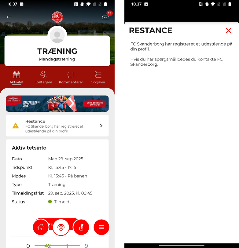 Du vil blive mødt af en advarsel under aktiviteten, hvis du: har en restance i klubben, mangler spillertilladelse til en kamp, eller hvis klubben har valgt at spærre dig fra at komme på holdkort.