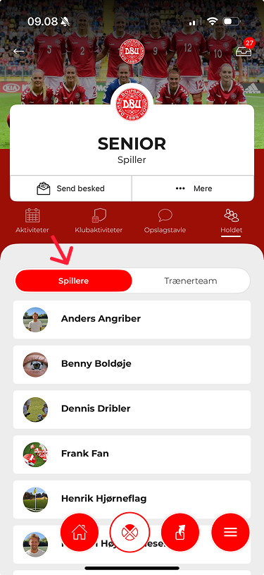 Klik på knappen "Spillere" for at få vist en oversigt over holdets spillere.