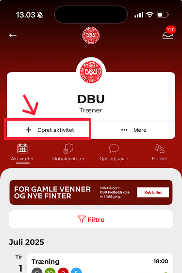 Du kan oprette aktiviteter til dit KampKlar-hold fra Mit DBU eller i Fodbold appen.