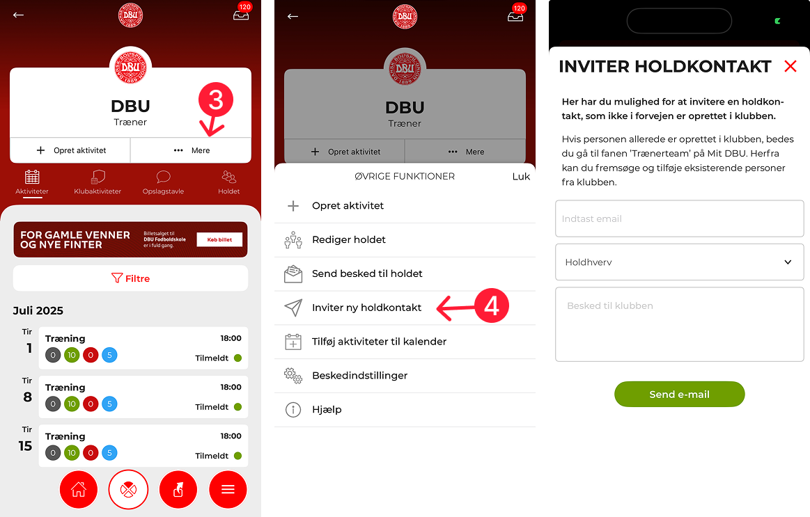 Fra 'Trænerteam' på Mit DBU, eller under 'Holdet' i Fodbold appen, kan man invitere en ny holdkontakt til holdet.