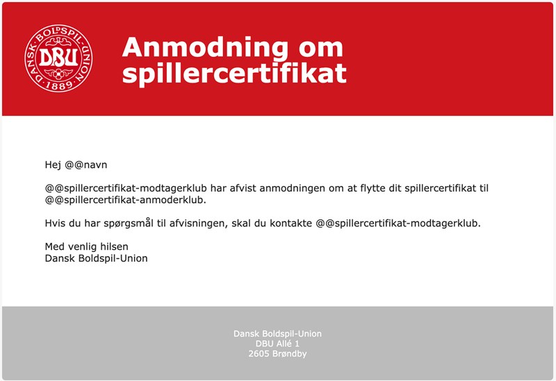 Sådan ser skabelonen ud til den e-mail, der sendes til spillere, som måtte få en anmodning om spillercertifikat afvist.