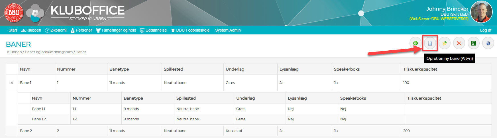 Menupunkt - "Klubben" -> "Baner og omklædningsrum" -> "Baner"