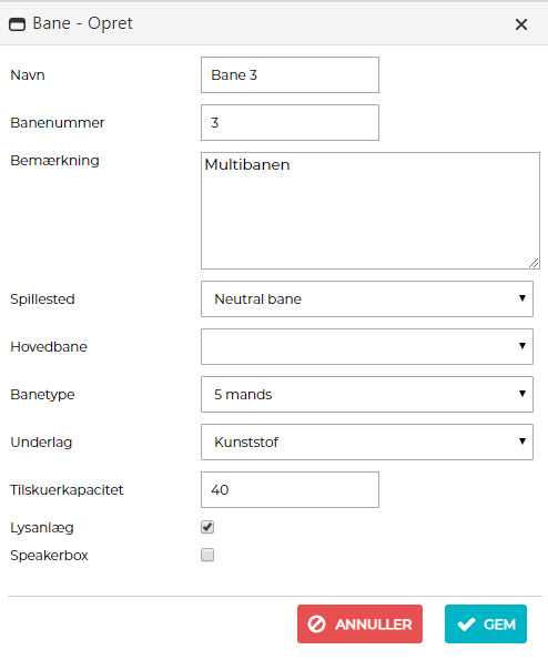 Her kan man oprette og se de baner der er oprettet i klubben.
