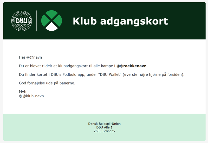 4) Når du har har tilføjet en person, vil vedkommende kunne se adgangskortet i DBU's Fodbold app, under DBU Wallet. Se også vejledningen til kortindehaver. Samtidig sendes en automatisk tildelingsbesked, som ser nogenlunde således ud: