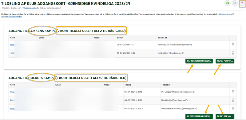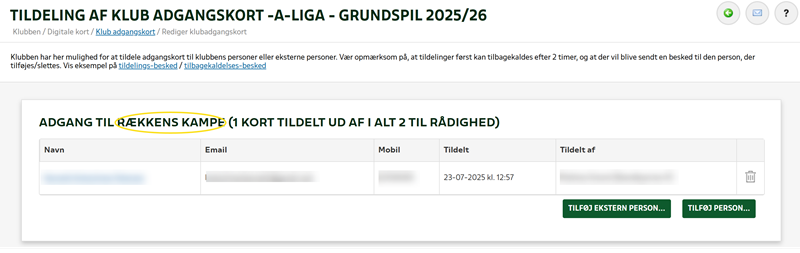Du kan se hvor mange kort klubben har til rådighed og hvor mange der er tildelt på række niveau og hold niveau.