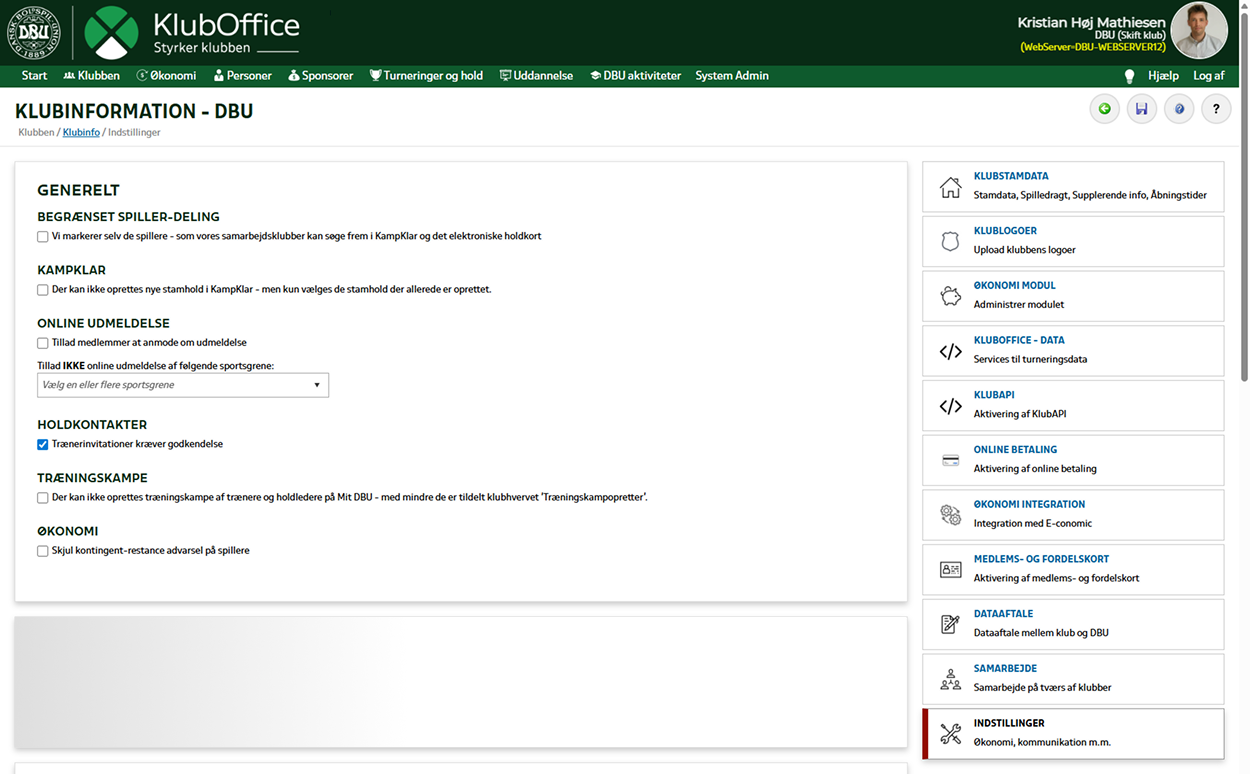 - Vælg om oprettelse af trænerinvitationer fra Mit DBU og KlubOffice kræver godkendelse.