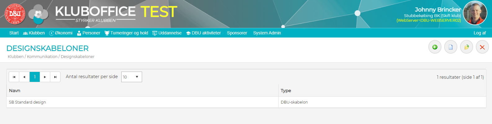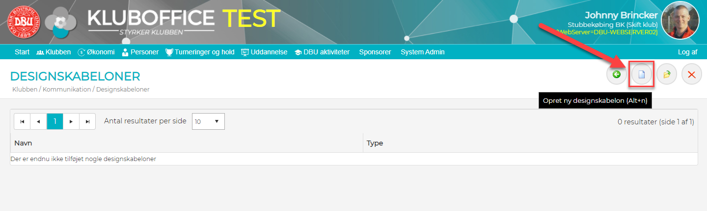 Designskabelonerne funder du i KlubOffice under menuen "Klubben" -> "Kommunikation" -> "Designskabeloner" hvor du kan se og redigere evt. allerede definerede designskabeloner, eller oprette en ny designskabelon ved at klikke på ikonet "Opret ny designskabelon (Alt+n)"