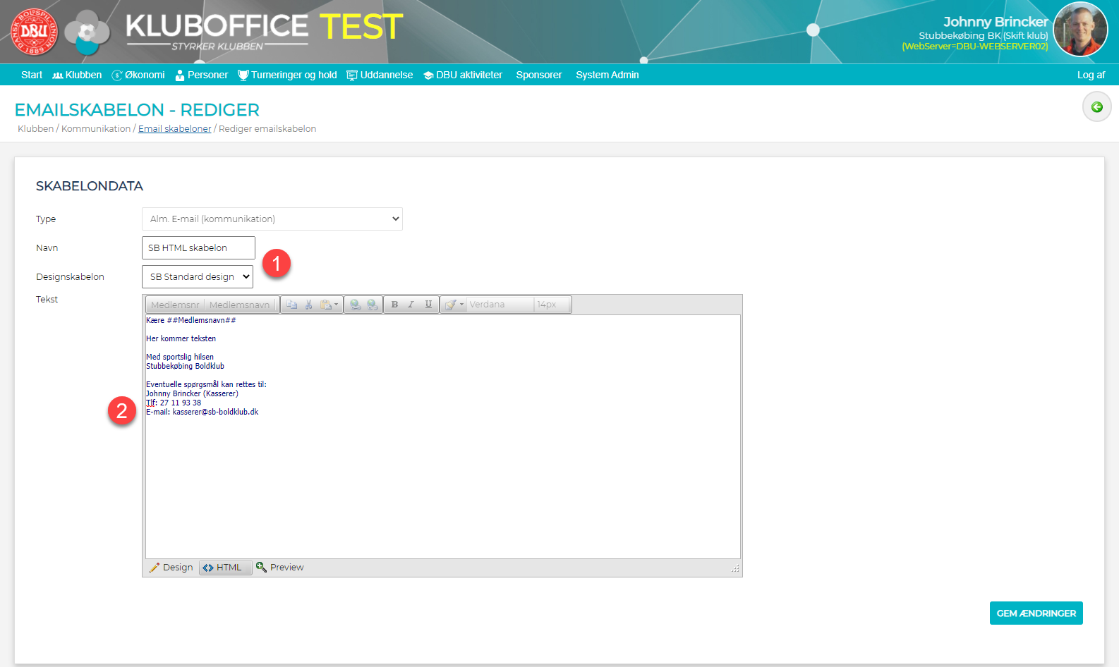 Designskabelonen tilknyttes de enkelte email skabeloner, hvor man ønsker at benytte disse, blot ved at vælge designskabelonen ud for "Designskabelon".