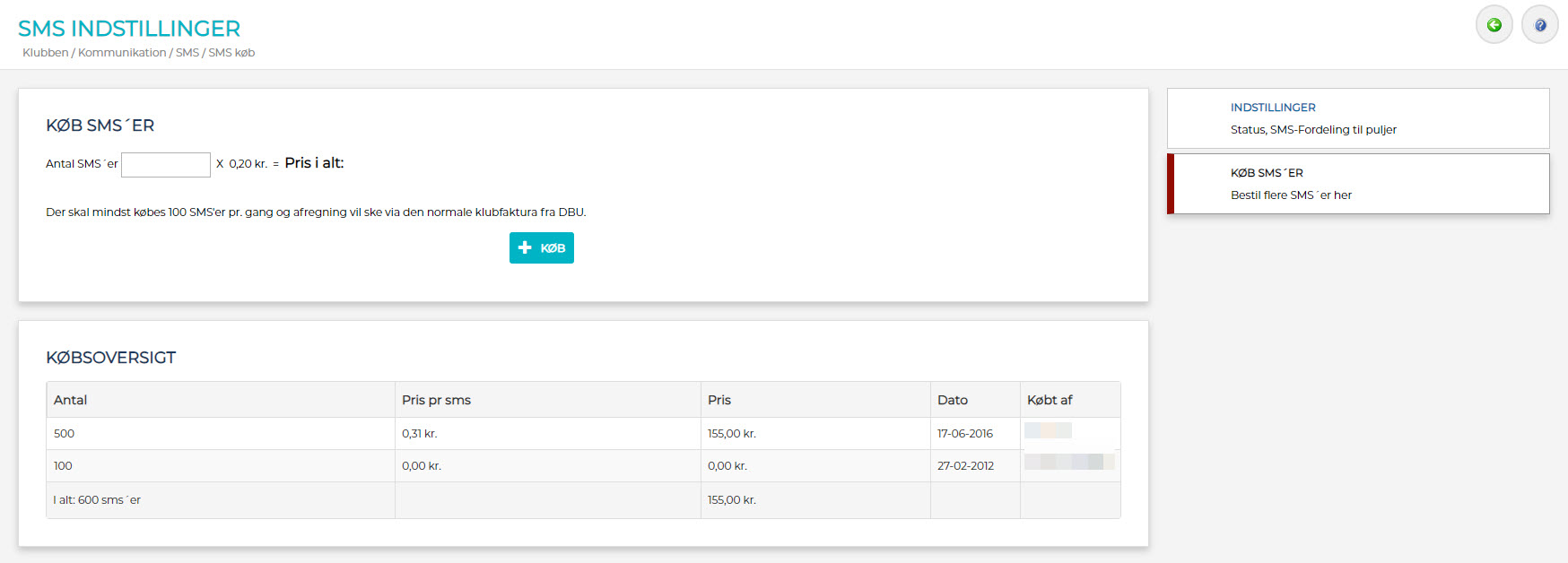 Der kan købes yderligere SMS'er - ved at indtaste antal under sektionen 'Køb SMS'er' og derefter trykkes der på knappen 'Køb'
