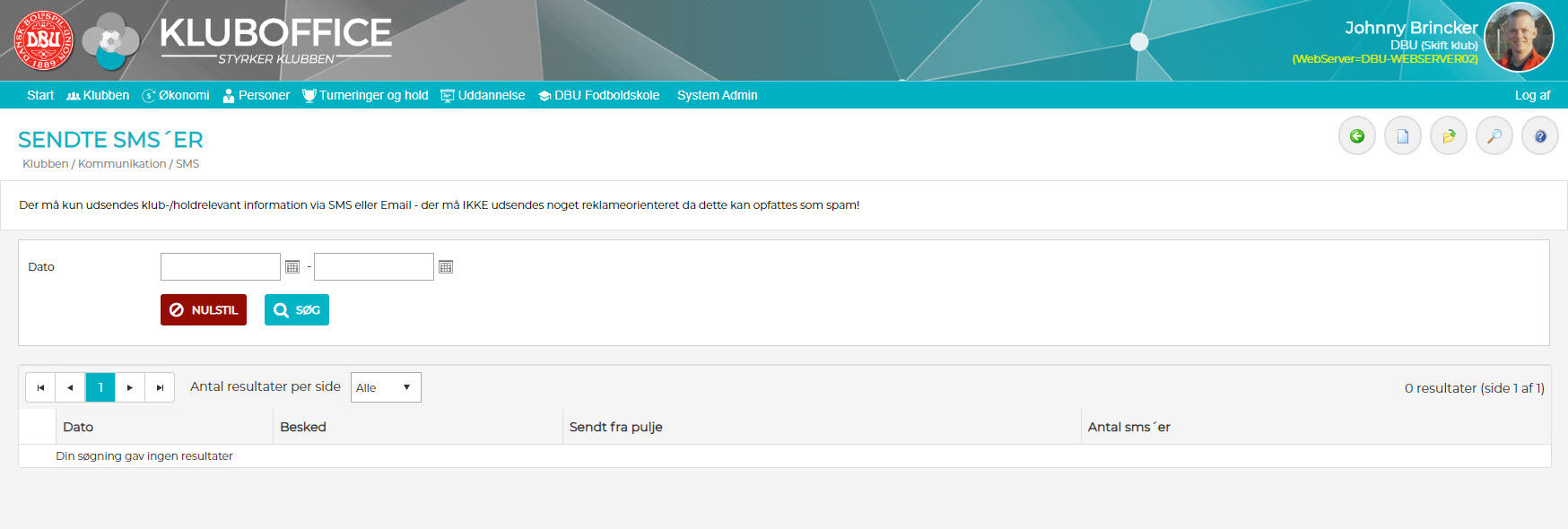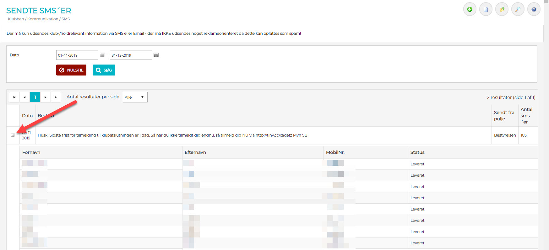 1) Her får du en oversigt over alle SMS'er som er udsendt fra KlubOffice