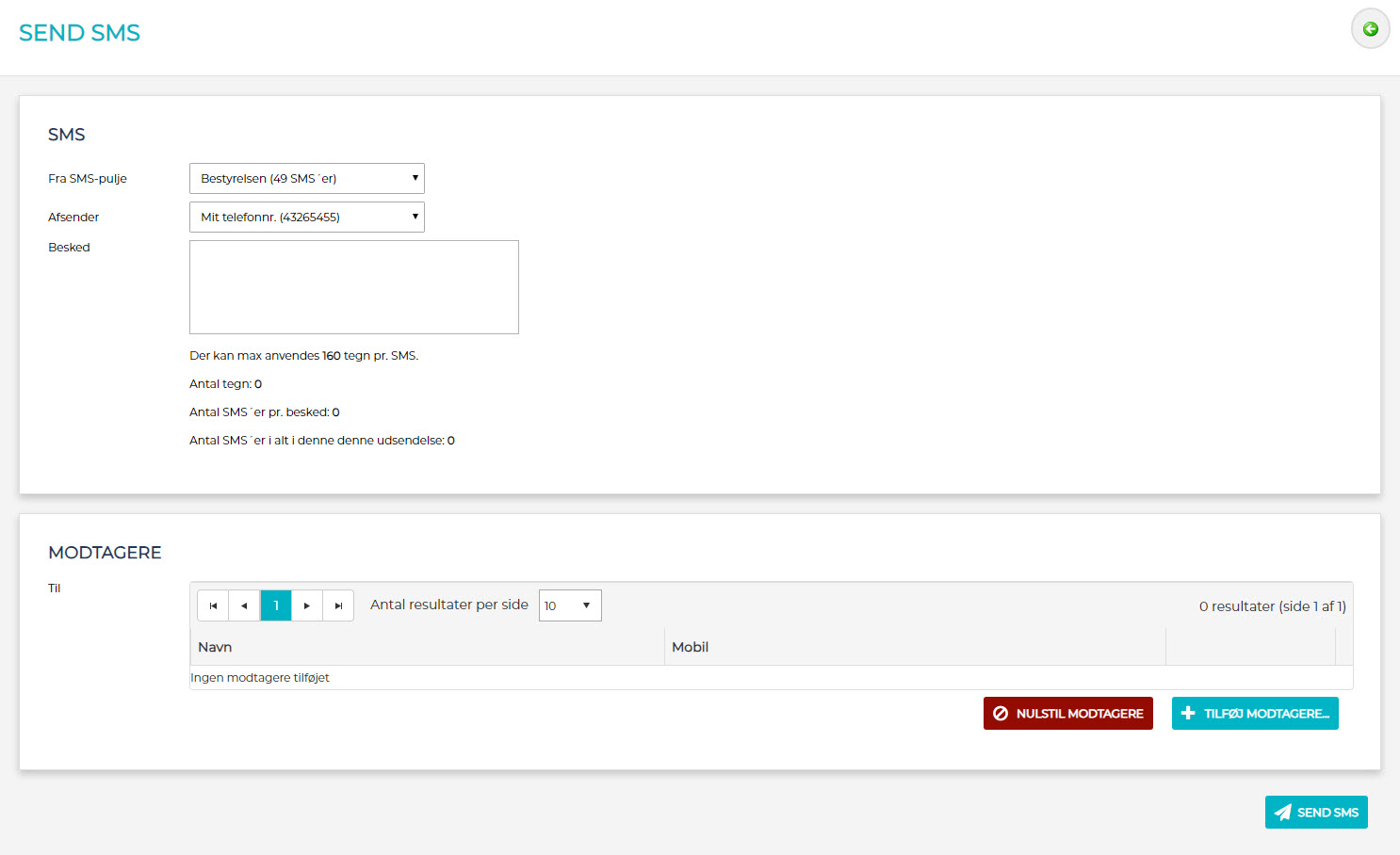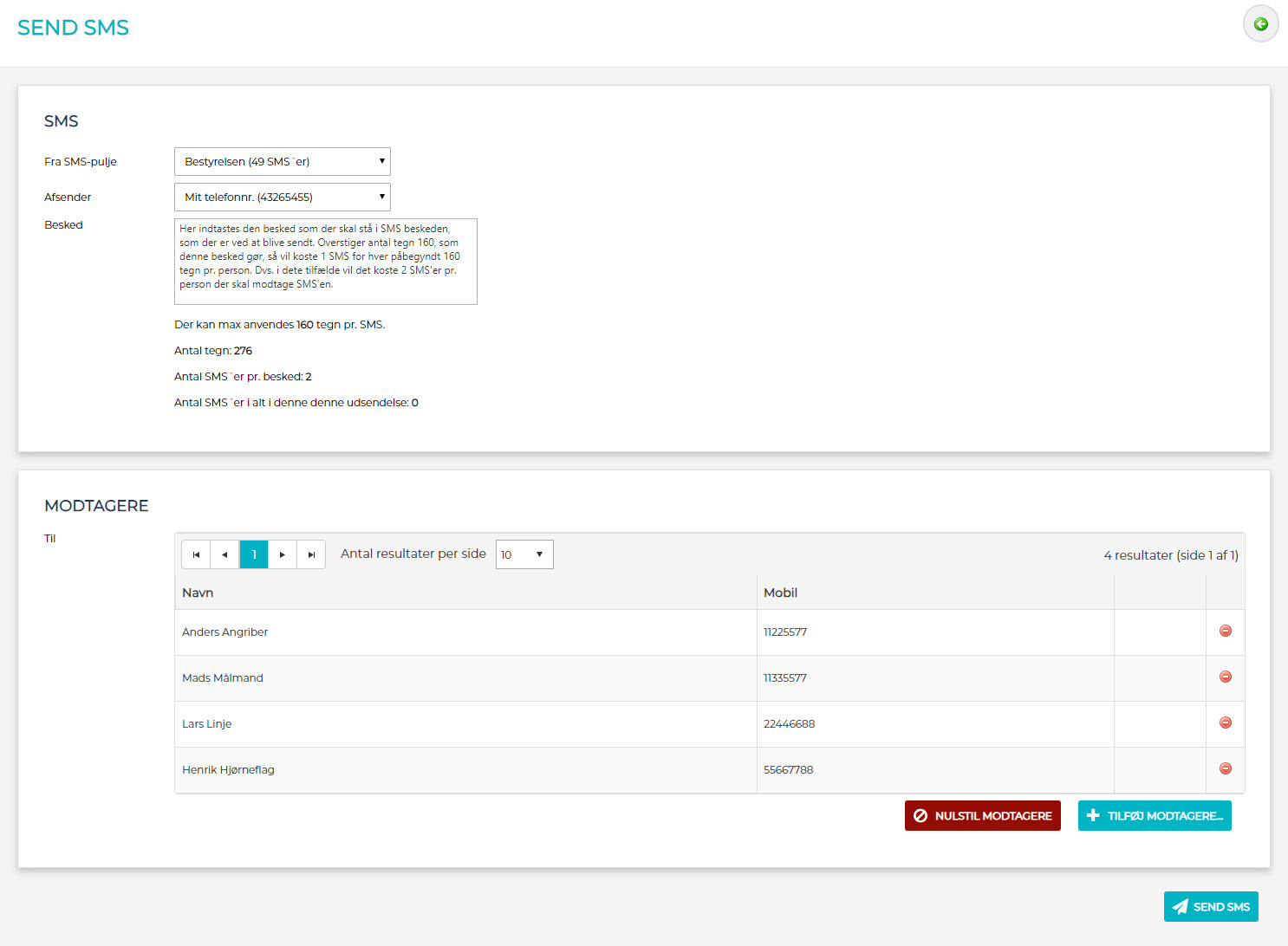 , vælg derefter hvilken SMS-pulje der skal sendes fra samt om det skal være dig selv eller klubben som skal stå som afsender. Klik derefter på "Tilføj" for at tilføje modtagere
