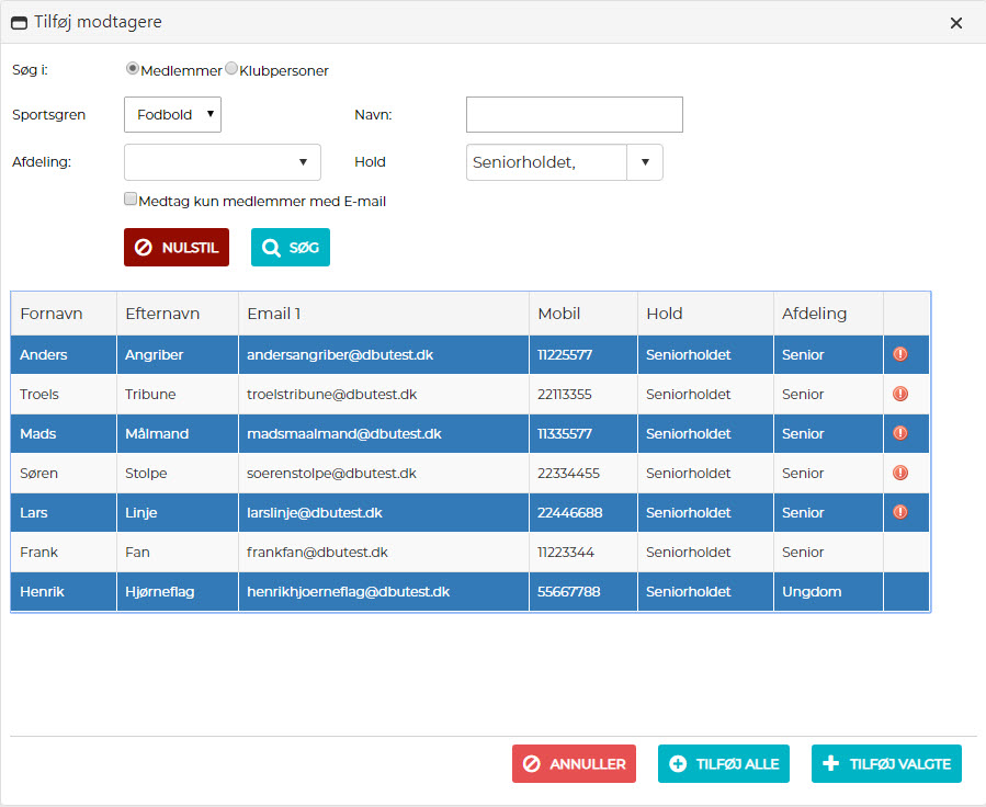 3) Søg medlemmerne frem, marker de medlemmer som skal modtage SMS'en og klik på "Tilføj valgte medlemmer"