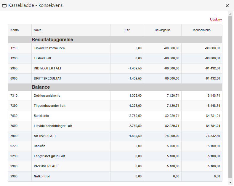 1) Inden bogføring af en kassekladde, kan man med fordel vælge funktionen "Vis konsekvens" for at få et overblik over konsekvenserne ved bogføring af kassekladden i sin nuværende form.