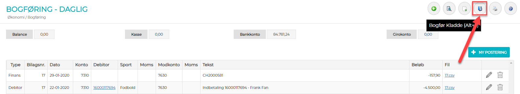 1) Når kassekladden er færdig - og evt. udskrevet - skal du bogføre kassekladden ved at klikke på ikonet ”Bogfør kladde” eller taste "Alt+c".