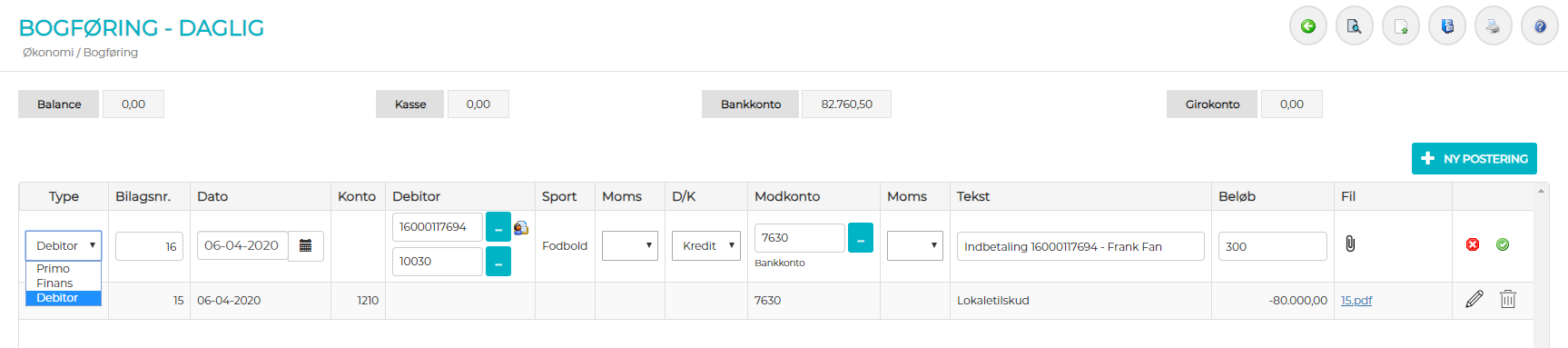 2) Du kan også ændre typen til f.eks. Debitor, hvor du så får mulighed for at indtaste et debitor nr. og/eller faktura nr., som så automatisk henter både beløb og tekst til beskrivelsen. Husk at klikke på det grønne flueben når du er færdig med indtastning af posteringen, for at gemme linjen i kassekladden.