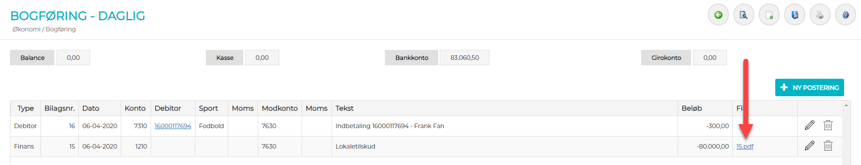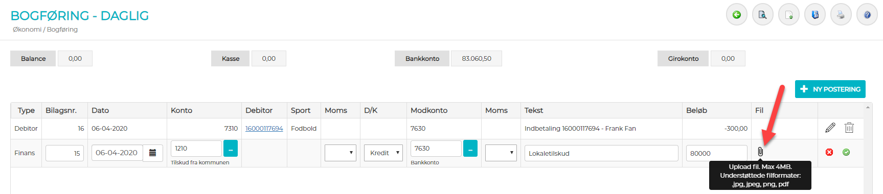 1) Har du et elektronisk bilag, f.eks. i .pdf format, er det muligt på den enkelte postering at uploade et bilag til posteringen. Det gøres ved at klikke på clipsen til højre på linjen og så vælge det dokument som man vil have vedhæftet.