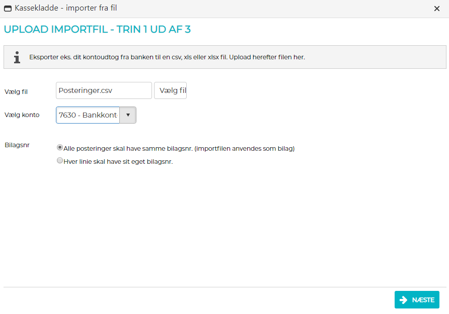 2) Vælg nu filen som skal importeres og vælg herefter hvilken konto som posteringerne vedrører. Vælg så om posteringerne skal importeres med hvert sit unikke bilagsnr., eller om alle posteringer skal have samme bilagsnr. og dermed bruge importfilen som bilag. Når alle valg er foretaget, så klik på "Næste".