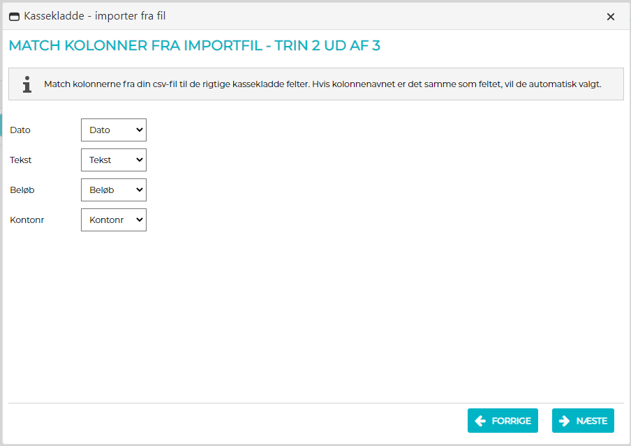 3) Match nu kolonnerne i den importerede fil til kassekladde felterne og klik på "Næste"