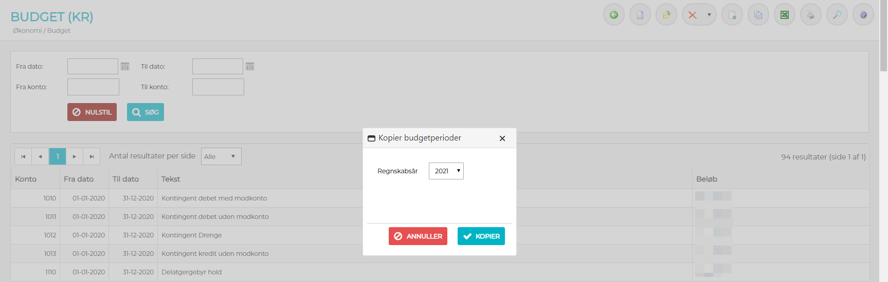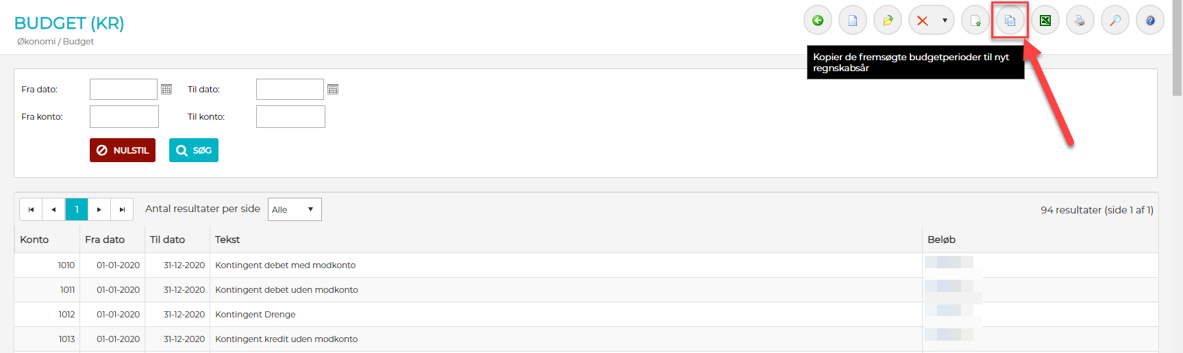 1) Søg de relevante budgetperioder som kopieres frem i oversigten og klik på ikonet "Kopier de fremsøgte budgetperioder til nyt regnskabsår"