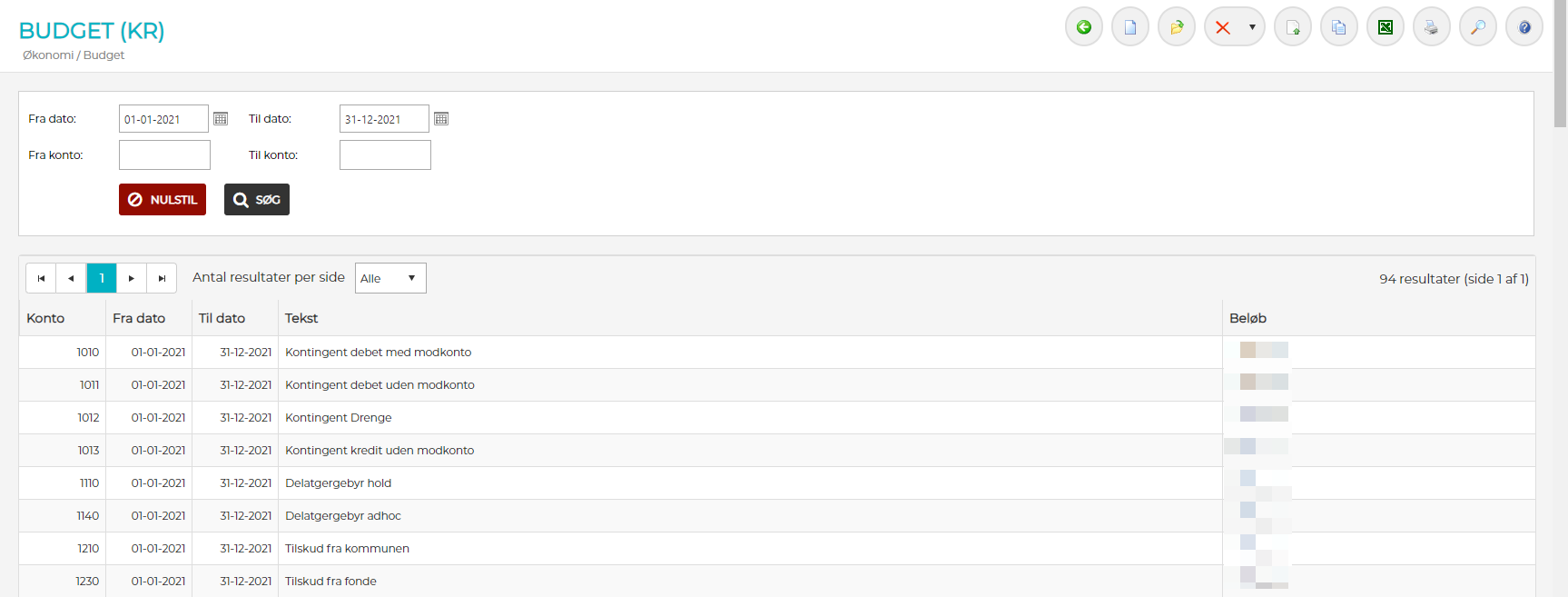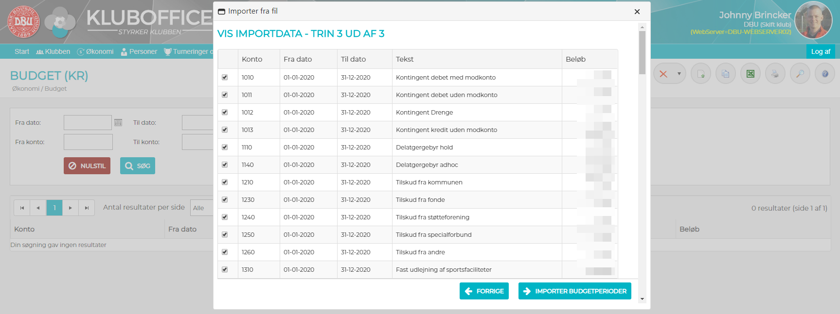 5) Alle de valgte budgetperioder er nu importeret til KlubOffice budgettet