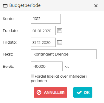 - Vælger du at markere "Fordel ligeligt over måneder i perioden, oprettes der en post for hver måned i perioden og beløbet fordeles ligeligt på hver af de måneder.