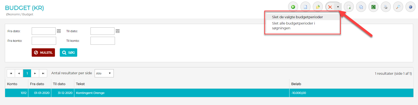 - Ønsker du at slette ALLE budgetperioder i den aktuelle søgning, så klik på ikonet med det røde kryds og vælg "Slet alle budgetperioder i søgningen"
