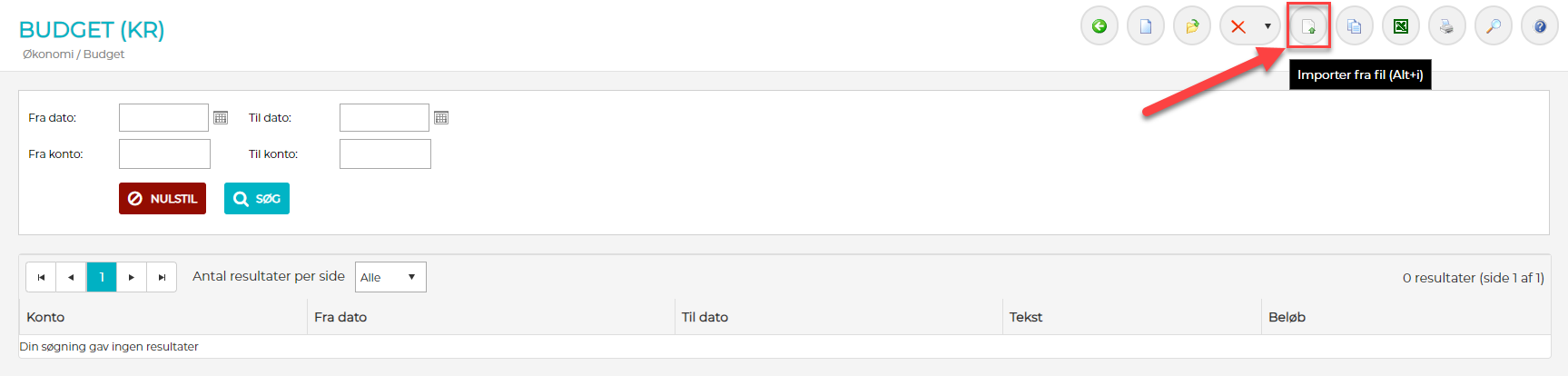 1) Klik på ikonet "Importer fra fil" for at starte en import af budgetperioder (understøttede filformater er .csv, .xls., .xlsx)