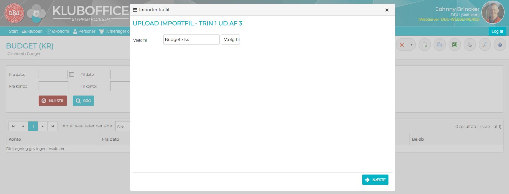 2) Vælg hvilken fil du vil importere budgetperioderne fra og klik på "Næste"