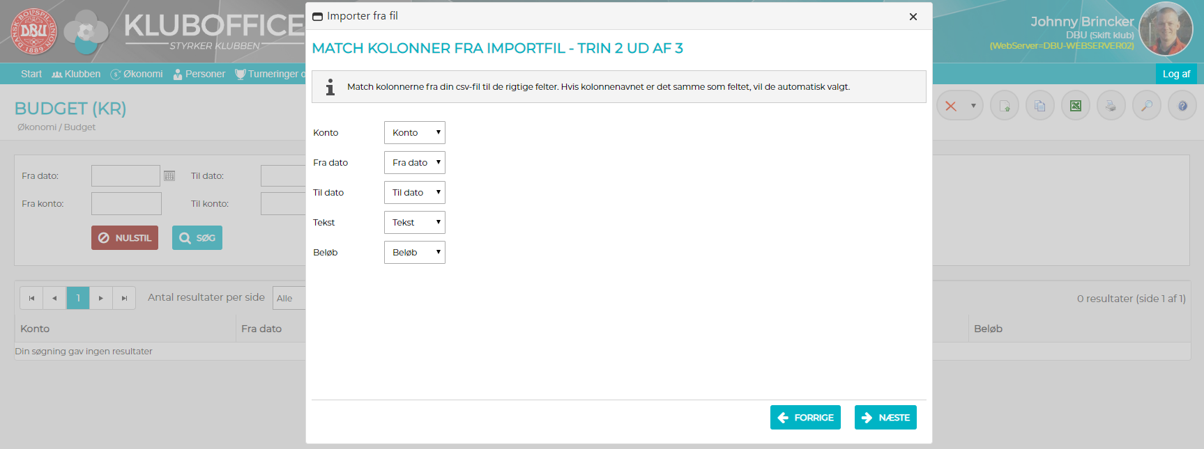 3) Match nu kolonnerne fra importfilen med felterne i KlubOffice og klik på "Næste"