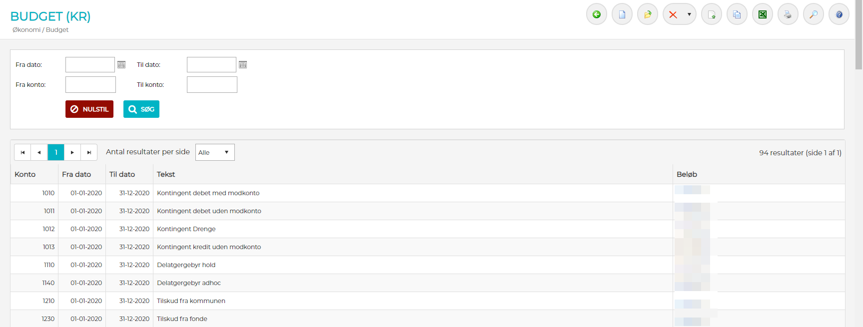 Budgettet oprettes i KlubOffice - Under menuen "Økonomi" -> "Budget", hvor der også er mulighed for at udskrive budgettet som selvstændigt dokument, eller eksportere det til Excel.